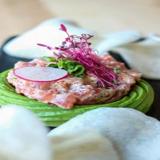 Thon, mayo épicé, avocat à l’extérieur, avec 4 chips de crevettes