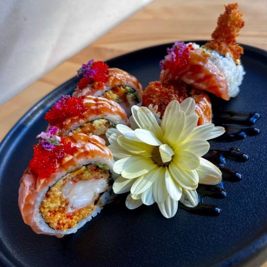 Lobster tail tempura, avocado, tobiko, spicy mayo with seared salmon exterior