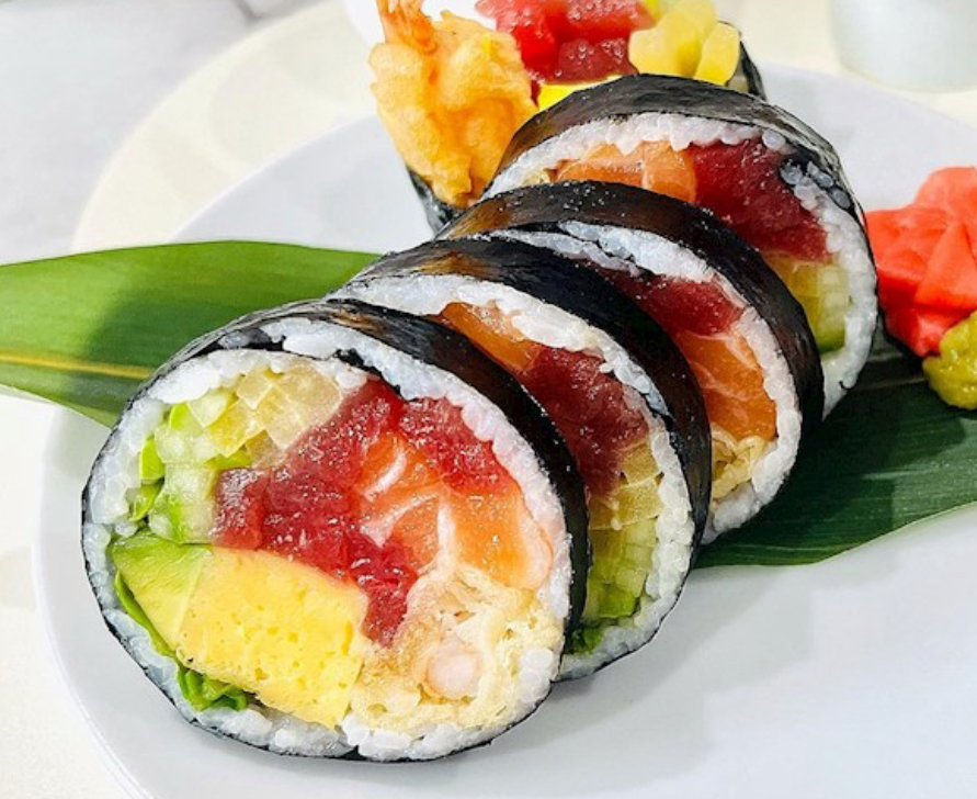 Nori sushi paper, rice, tuna, avocado, oba-shiso, cucumber, oshinko, tempura shimp