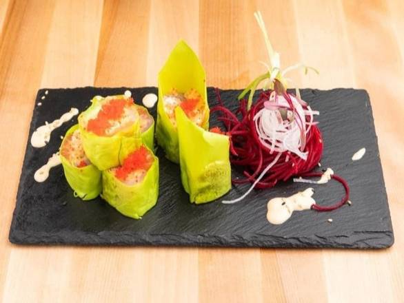 Tartare au crab des neiges, sashimini de thon et saumon, avocat, tobiko, oignon frit, mayo épicé, échalotte (6 mck)