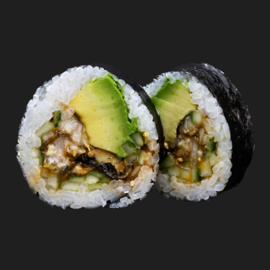 Anguille grillée, avocat, concombre, laitue mixte, tobiko, sauce teriyaki